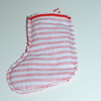 Przeszywamy zgodnie z linią szablonu zaś górę skarpetki podwijamy tworząc ładną lamówkę w którą wszywamy szlufkę jednak nie jest to konieczność. Całość wycinamy pozostawiając ok 0,5cm zapasu i prasujemy naszą skarpetkę.