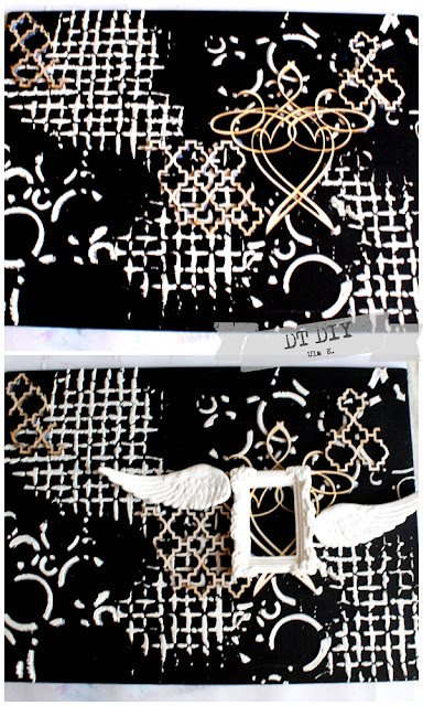 Wszystkie przyklejone elementy malujemy czarnym gesso. Ja elementy z lekkiej masy plastycznej (skrzydła, ramka, dziurka od klucza) pomalowałam delikatnie.
